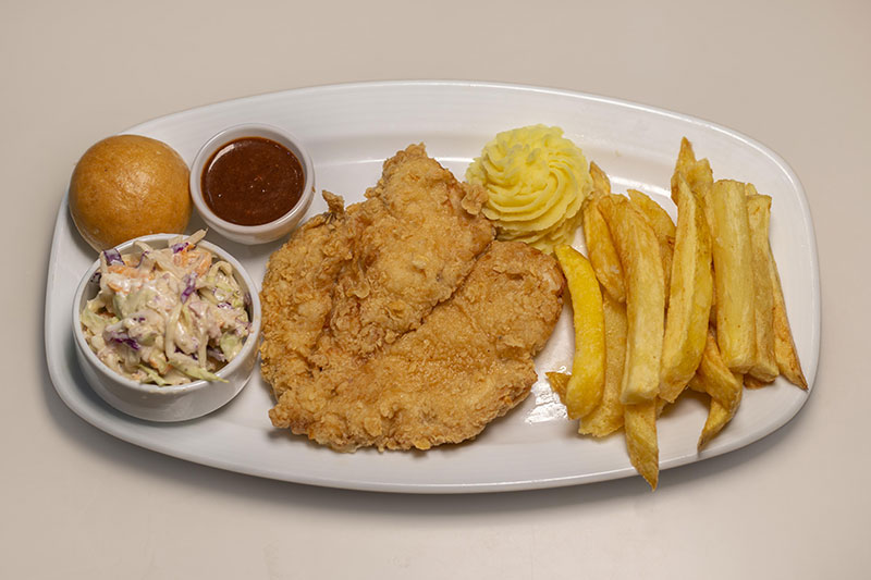 شنيتسل سينه مرغ سوخاري همراه با سس مخصوص باربيکيو + پوره سيب زميني